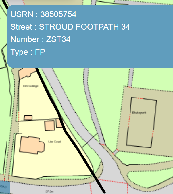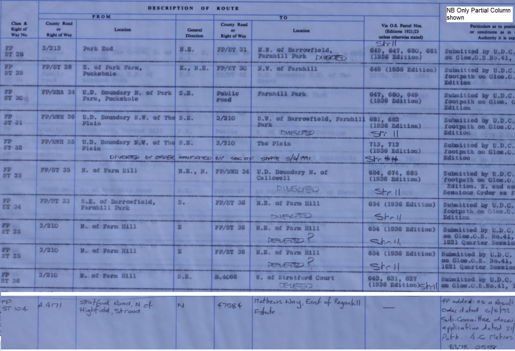 What is shown on the Definitive Map as Stroud Footpath ST36 runs from Farmhill through the edge of Stratford Park is shown as running through the gardens of two adjoining properties, but it has also been renumbered as ZST34 – or rather what was shown on the map as ST34 has been extended to cover part of ZST36, following development at the northern end, where part of ZST36 was extinguished.