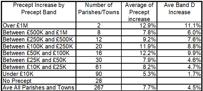 This table looks at parishes by population size and average size of Band D precept