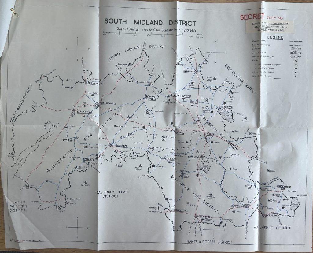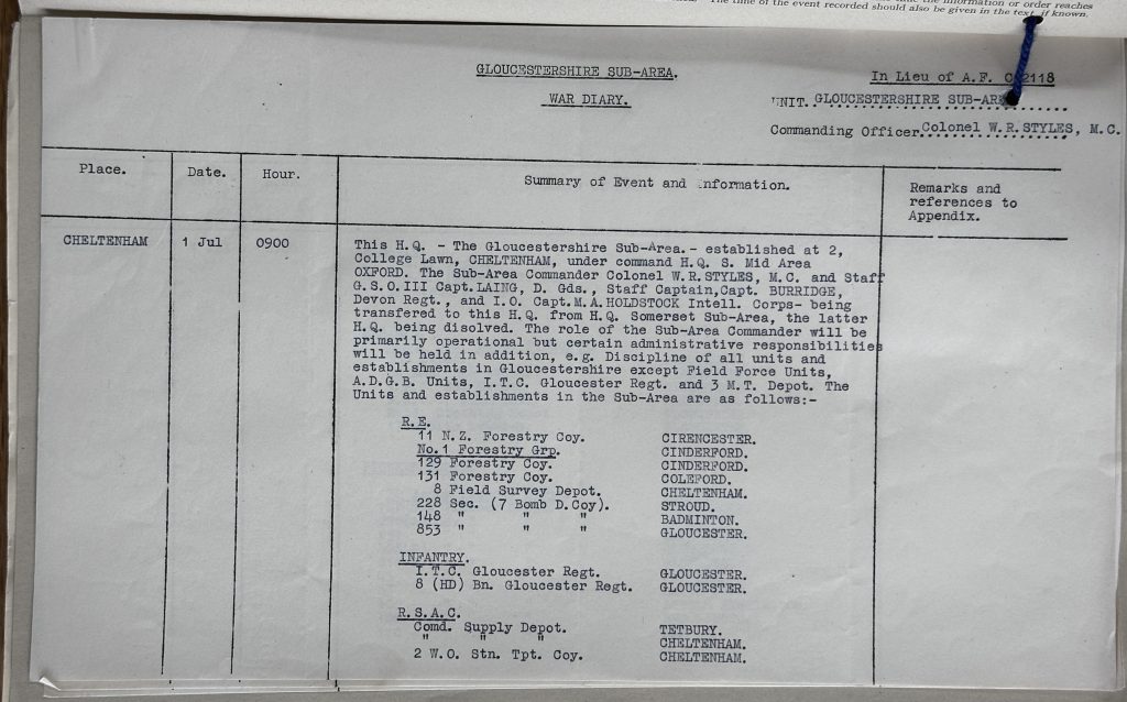 During World War II the defence of Gloucestershire was the responsibility of South Midland District and on 1 July 1941 Gloucestershire Sub District was formed with Colonel W. R. STYLES as the Sub-Area Commander, he was later replaced by Colonel K.F.W. Dunn CBE.