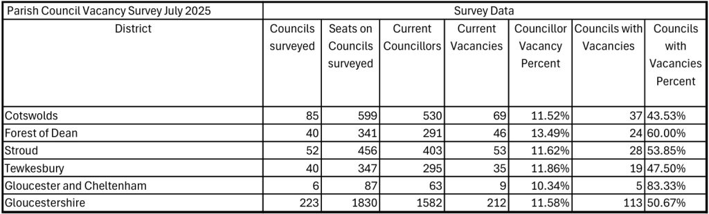 In July 2025 I undertook a survey of available public data on Parish and Town Council vacancies across Gloucestershire and this is a publication of the data from from this research. There are no current plans to update it. Although it might be useful for others to do similar surveys in other counties to evidence the extent to which parish and town council vacancies occur.