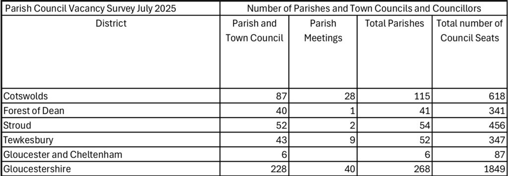 There are in total 268 parishes across Gloucestershire, these include 40 parish meetings, these are small communities and do not have an elected parish council and the parish meeting, which can be attended by all electors make decisions, electing a Parish Meeting Chair on an annual basis.